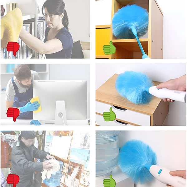 Savijajuća glava prilagođava se svakom obliku, omogućujući vam čišćenje lopatica ventilatora, vrhova ormara, rubova namještaja i uskih kutova bez napora. Prašina se skriva posvuda—ovaj prašnik je pronalazi svugdje!